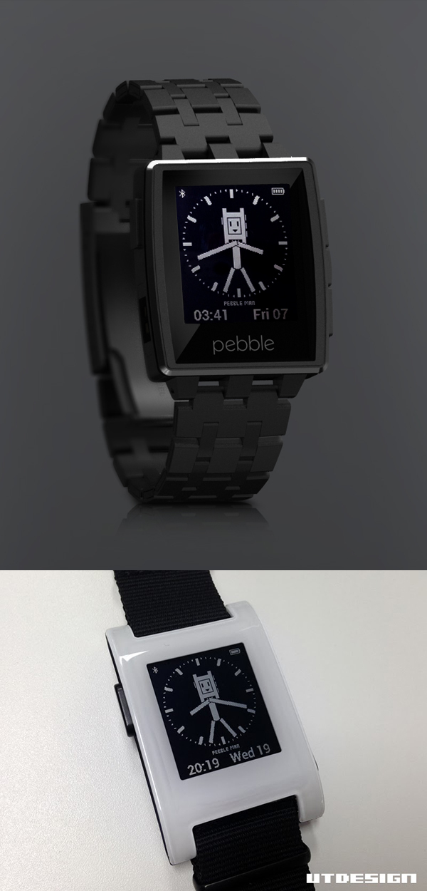 顔がPebbleなPebble Manの手が現在時刻を表示しています。